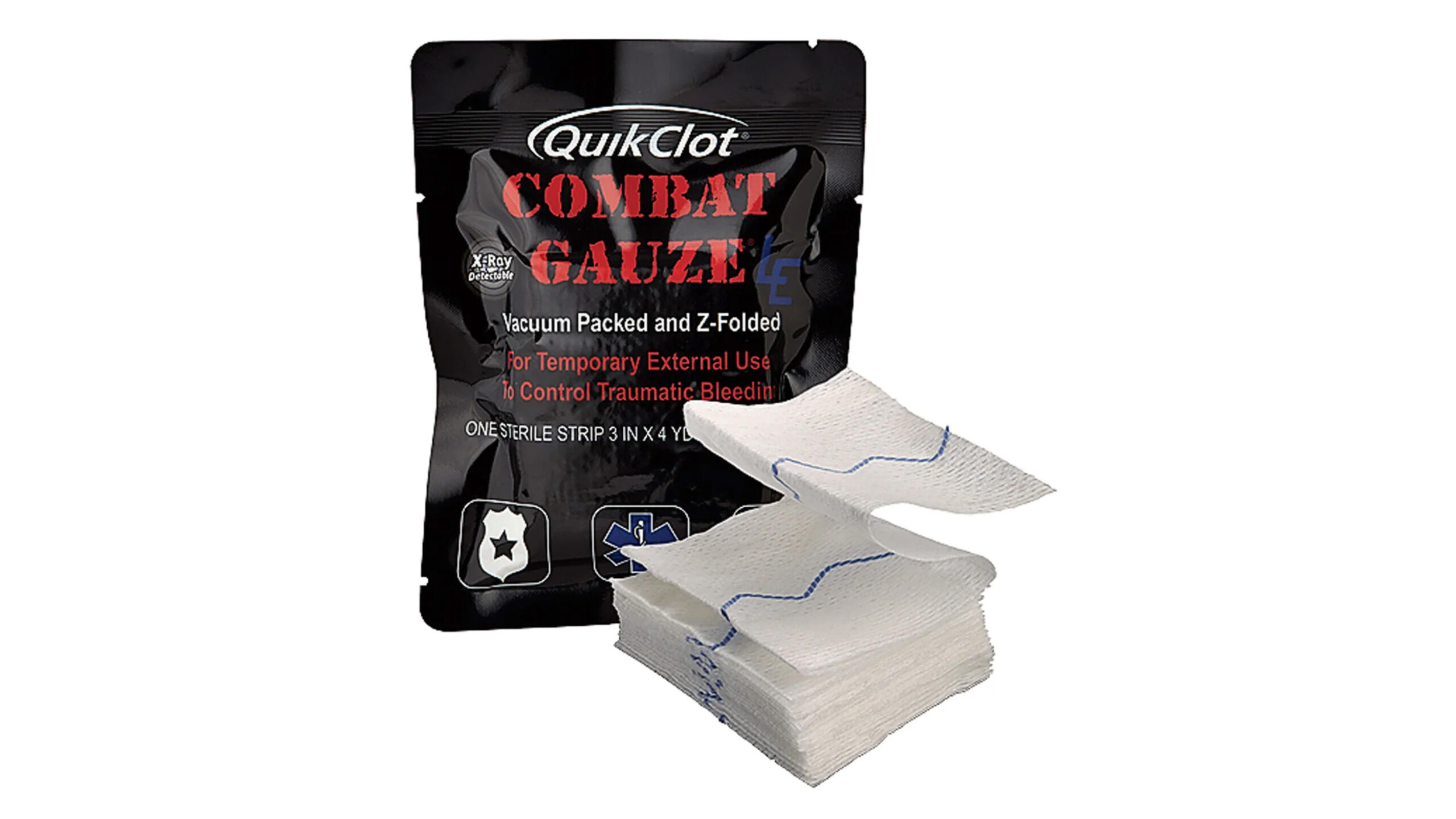 The material, pliable and familiar to medical personnel, can be fitted to any size or shape wound (including penetrating wounds). Plus, it is easily removed once clotting has taken place. Combat Gauze® comes in rolls four yards long by three inches wide.